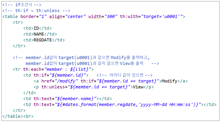 - Thymeleaf에서 if ~ else와 같은 조건문을 사용할 때 th:if ~ th:unless를 사용한다.