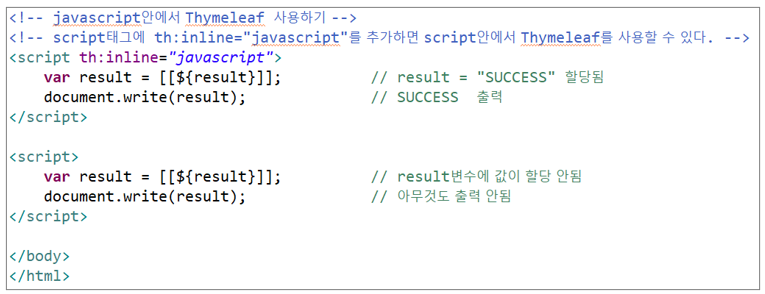- script태그에 th:inline="javascript"를 추가하면 script안에서 Thymeleaf를 사용할 수 있다.