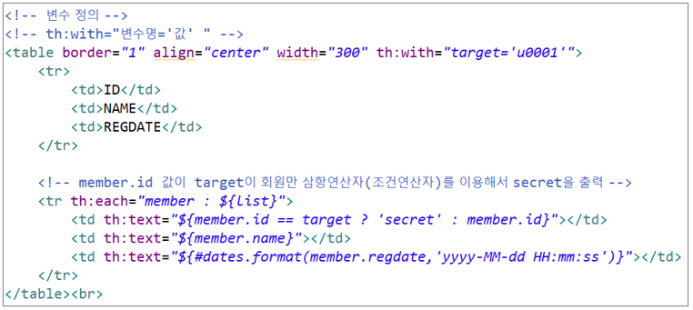 Ex) 변수를 정의하는 th:with를 <table> 태그 안에서 쓰면 테이블 내에서 사용되고, <tr> 태그 안에서 쓰면 <tr> 태그 내에서만 사용된다.